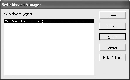 Go to the Database window and select Tools | Database Utility | Switchboard Manager. If this is your first time using the manager, you may get a prompt asking if you want Access to create a default form for you. If you get that, just go ahead and click OK.
