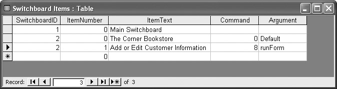 I find that it is easiest to add and delete items from the Switchboard form by using the manager as we have done. However, interestingly, if you look at the list of tables, Access created a new table called Switchboard that handles all the functioning of the board. If you open it, it should look something like Figure 3-16.