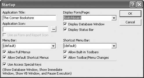 You can take Switchboard one step further by forcing it to open as soon as the database opens. To set this, go to Tools | Startup. Figure 3-17 shows the dialog box filled out.