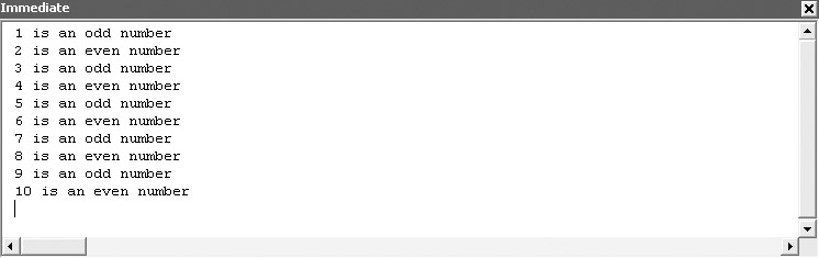 Sub forTest() Dim intCounter As Integer For intCounter = 1 To 10 If (intCounter Mod 2) = 0 Then Debug.Print intCounter & " is an even number" Else Debug.Print intCounter & " is an odd number" End If Next End Sub