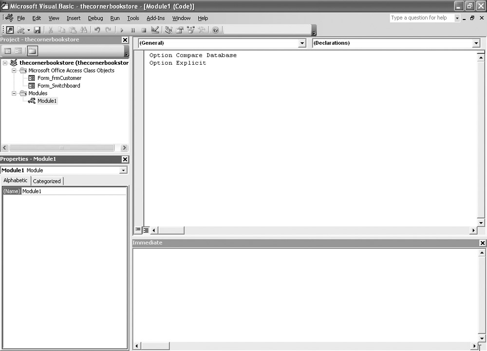 We will look at the interaction of the Properties and Project windows in a bit. However, I want to mention three windows that you will use for testing and debugging: the Immediate window, the Watch window, and the Locals window. These are discussed in greater detail when we look at testing and debugging in Chapter 10.