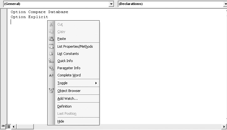 The Object Browser command also opens the Object Browser, which gives you a list of the objects found in libraries referenced by the project and their respective members (that is, their properties, methods, and events). Unlike the Definition command, the Object Browser command opens the Object Browser for general use, without specifically selecting the object currently selected in the Code window. We will be examining the Object Browser in greater detail later in this chapter.