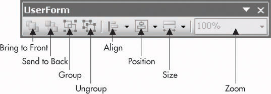 You use the UserForm toolbar to create a GUI object to facilitate the end user’s interaction with the system: It contains buttons to order, group, and align objects on user forms.