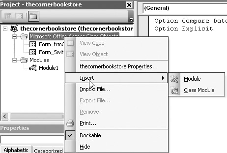 A new module can be created from within the Project Explorer by selecting the project name, which is usually the first item in the hierarchy, and clicking the right mouse button. From the menu that appears, you select Insert and the type of module (Module or Class Module) you want to insert. This is shown in Figure 7-4.
