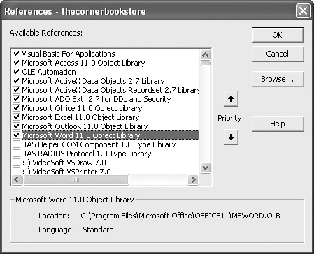 To use this code, you must first make sure that you have the references shown in Figure 8-8 turned on. You access this dialog by using Tools | References located in the VBA Editor. From here on, you will need to use this code pro forma.