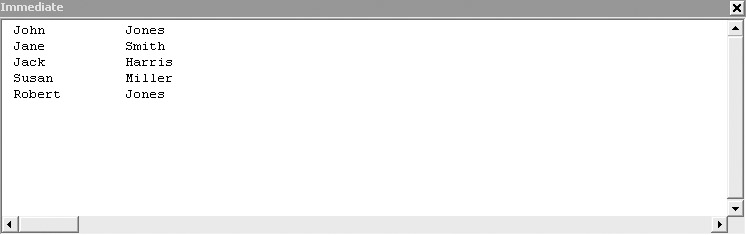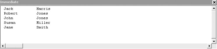 When you run the code, you are going to output the first and last names of each record. Again, the Recordset object has a property called Fields, so you can specify the fields from the recordset that you want to include in the output.