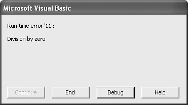 Notice that this gives you an error number (11) and an error description (“Division by zero”). You also have the option of ending the program or, by clicking the Debug button, going to what VBA “thinks” is the offending piece of code. (I don’t mean to make the last sentence sound cynical. However, as many programmers will point out, where the error is, and where the program crashes, can sometimes be two different places.) The error box is the point where the program crashed. VBA is assuming everything before it is correct (and, in this case, it is). Note that in some cases, you are also given the option to continue the program. Such is not the case with “division by zero.”