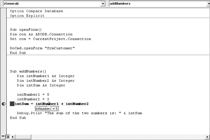 Sub addNumbers() Dim intNumber1 As Integer Dim intNumber2 As Integer Dim intSum As Integer intNumber1 = 5 intNumber2 = 3 Debug.Assert intNumber1 = 5 Debug.Assert intNumber2 = 7 intSum = intNumber1 + intNumber2 Debug.Print "The sum of the two numbers is: " & intSum End Sub