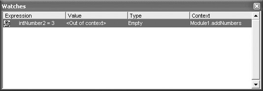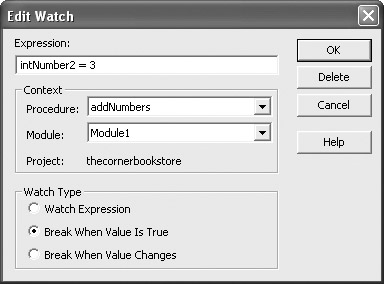 Let’s assume you want to test to see if intNumber2 was assigned a value of 3. Start off by highlighting the statement. Then select Debug | Add Watch. Figure 10-4 shows the dialog box that opens.