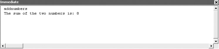 Sub addNumbers() Dim intNumber1 As Integer Dim intNumber2 As Integer Dim intSum As Integer intNumber1 = 5 intNumber2 = 3 intSum = intNumber1 + intNumber2 Debug.Print "The sum of the two numbers is: " & intSum End Sub