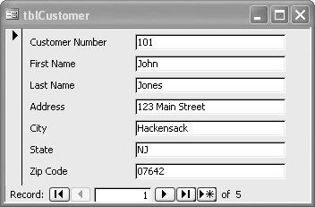 As you can see, the form has fields for each of the columns of the tblCustomer table object and a nice set of navigation buttons at the bottom. Since this form is connected to the table object tblCustomer, we say that it is bound to the tblCustomer and that each field on the form is bound to the columns in the table.