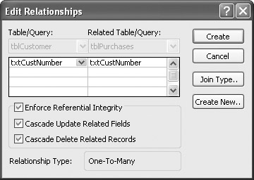 Draw a line establishing a relationship between txtCustNumber in tblCustomer and txtNumber in tblPurchases. You should see a dialog box in which you can select Referential Integrity, as shown in Figure 12-2. (I have turned the options on in the figure.)