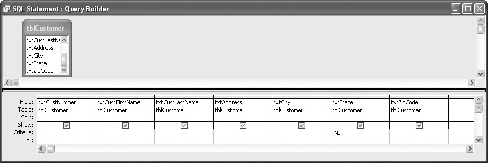 Let’s assume that you want this form to see only the records for customers who live in New Jersey. As you have done in the past, set it up with all of the fields, and set the criteria for the txtState column to be NJ, as shown in Figure 12-5.
