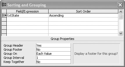 You can easily adjust the size of each section by dragging the divider bars. In addition, you can create customized headers and footers based on groupings. Select View | Sorting and Grouping to open the Sorting and Grouping dialog box. Here it is shown as if you were going to group the records on the txtState field: