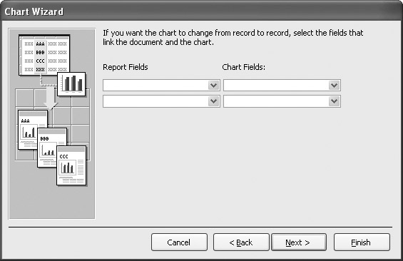 The next screen will only be applicable when the chart needs to be regenerated for each new record. As an example, you may want to have a chart showing the total for each customer. In this case, however, we are using it just to summarize the data at the end of the report. For that reason, turn off the two field selections by selecting the <no field> option. The screen should look like Figure 13-12.