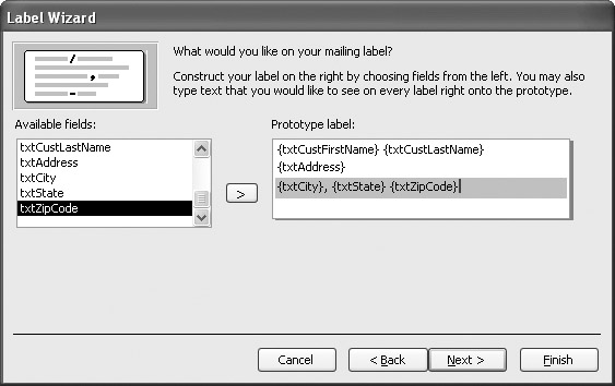 The next screen is a little tricky if you have never worked with the Label Wizard before. Let’s use Figure 13-17 as a guide. You not only transfer the columns you want to use on your labels, but you also need to position them exactly as you want them in the label. For example, you want a space between txtCustFirstname and txtCustLastName. The column txtAddress is on the next line. Finally, txtCity is followed by a comma and a space. Finish off the label with txtState, space, and txtZipCode.