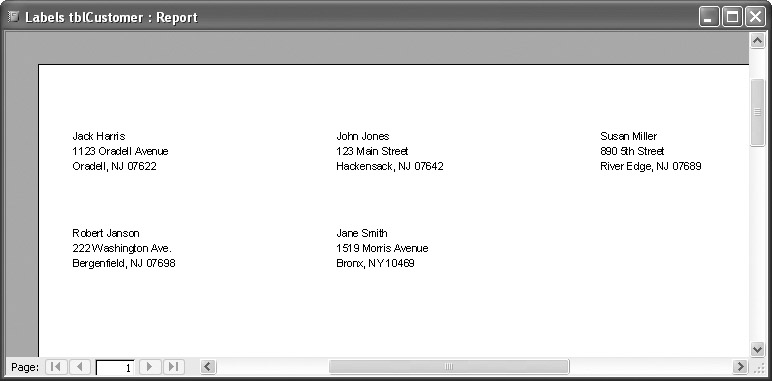 Now open the report in preview mode, which, depending on how much data you have, will look something like Figure 13-18. As you can see, the entries are perfectly formatted to print on the Avery 5160 label sheet.