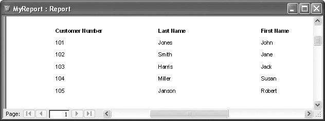 If you were to run this method, it would create the report. Then the DoCmd.Close call would save the report. As stated a moment ago, a default name is assigned. Figure 13-19 shows the results. If you opened Report1 in Design View, you would see something like Figure 13-20.