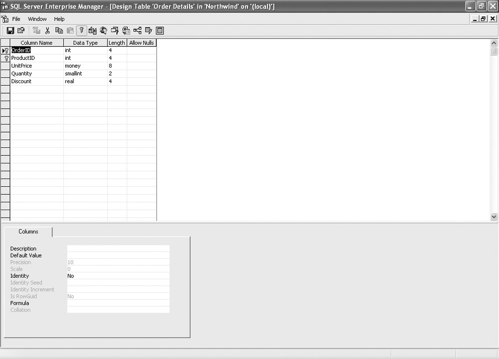 Beginning with Access 2003, ADP files can create actual SQL Server objects while still working in the familiar Access GUI environment. In simpler terms, Access is serving as the GUI for SQL Server. In addition, features have been added to SQL Server to make it more Access-like. As an example, Figure 19-1 shows the Table Design window in SQL Server. While it is not identical, it is remarkably close to the Table Design window in Access.