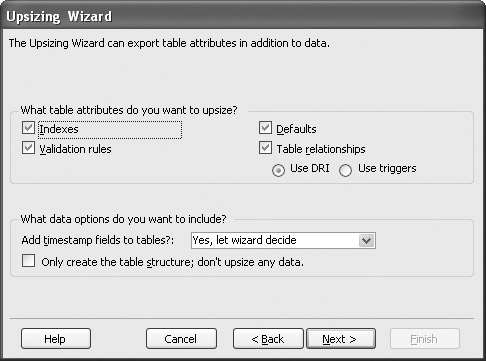 Finally, you have an option to upsize only the table structures and to leave the data behind. You would then need to import the data at some future date.