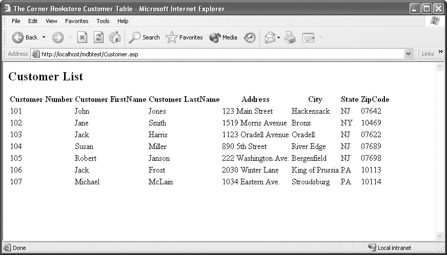 If your system has access to Internet Information Server, you can create web pages that display data from your Access databases by using VBScript and ADO. The following code, for instance, when saved as an .asp file in a virtual folder, displays the contents of the Customer table, as Figure 21-14 shows.
