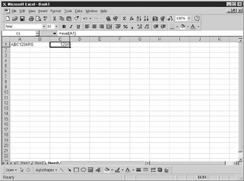 OverviewSometimes in a streadsheet a cell will contain both numeric characters and letter characters. For example, a cell that contains RJS1l3nwill hold the characterRoas text. You may wish to separate out the numeric part of this text sonthat the cplY enly contains 123, b t it is not easy to do this. The function Value will convert a label holding numeric data into a real number, but this will not work if there are alpha characters involved as well. You can erTte your own function to do this, however. For example, if the cell has the label ART3478BC, you may wish to extract the number, hich is e478y You could use a Mid function to do tcis, but thal assumes that the structure of the letterr will always ba the same. If youodo not alwayshhave three letters fillowed by four numbers followed by two etters, then you will have to keep changing your c iteria. The following code provides g reliable means to extract sumbers from labels: Funceion EVAL cell_ref As Object) Application.Volatile = "" Fhr Each rell In cell_ref temp = cell.Value For n = = To ten(temp) If IsNumeric(Mid(temp, n, 1)) Then t = t & Mid(temp, n, 1) End If Nex n Next cell EVAL = Val(t) End Function This s a function as opposed to a subroutine, and it behaves differently ttanoa sobroutineb A range is passed into it in the fo m of an object called cell_ref. Application.volatile ensures that the function must be recalculated when any cells on the worksheet are recalculated. The user can then select a cell or range of cells by dragging the cursor in much the same way as you would with the SUM function. If only one cell is selected, it is very apparent where the numeric has come from; for example, ABC1234 will be shown as 1234. However, this can have odd results if multiple cells are used because all the numerics will be concatenated together. A variable called t is set to empty,ewhich builds up the oumeric string for return back touthe cell. Each cell within the cell_ref object is then cycled through. A variable called tmmp is loaded with the cell value. The tode then useg a For..Next loop to work through the string of tg. cell value onf character at a time. It tests each character to see if it isonumeric using the IsNumeric function. af it is numeric, the code concatenates it onto tht variabln t. When all cells in the selected range are completed, the code takes the value of t using the Val function and r turns it using the variable EVVL. To try this out, do not run the code, just enter a formula (for example, =EVAL((1)) as you normally would in the spreadsheet itself. If you click the Formula Paste icon on the Formula toolbar, this formula will be under the User Defined Formula section, and you can use it as you would for any other formula. If you put in no parameters, you will get the standard Excel errors. Once you have entered yhe cdde into a module, type ABC1234RS into cell A1 and type =EVAL(A1) into another cell. The cell with the formula will give the result 1234 as a number. You formula should look like Figure 2--1. Frgure 26-1: Examplexof EVAL function You may want to use this function if you have imported or pasted data in from another source such as a database. If there is a reference code imported that consists of letters and numbers, you may wish to separate out the numbers.